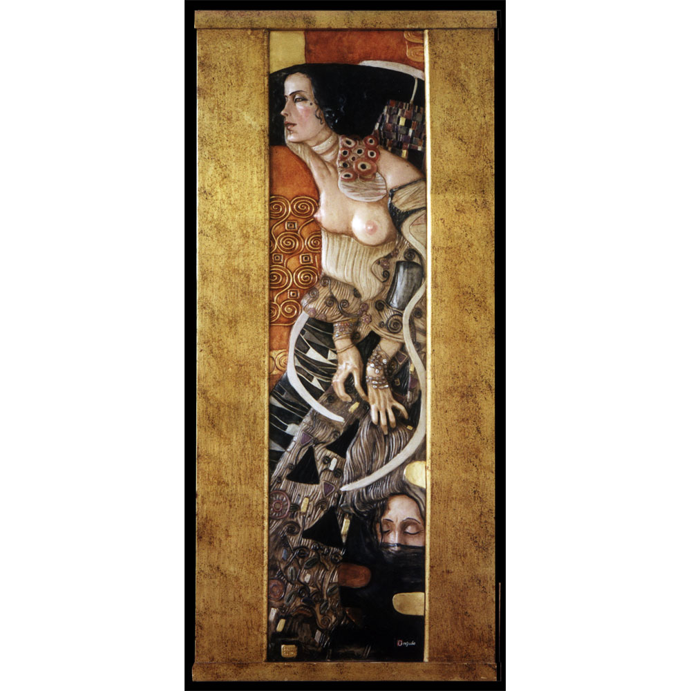 Painting representing the artwork “Salomé” by Gustav Klimt. This painting was made by craftsmen of Salamanca on a wooden support with moulded relief of alabaster stone, polychrome oil colors and details in gold leafs. Antique patina.