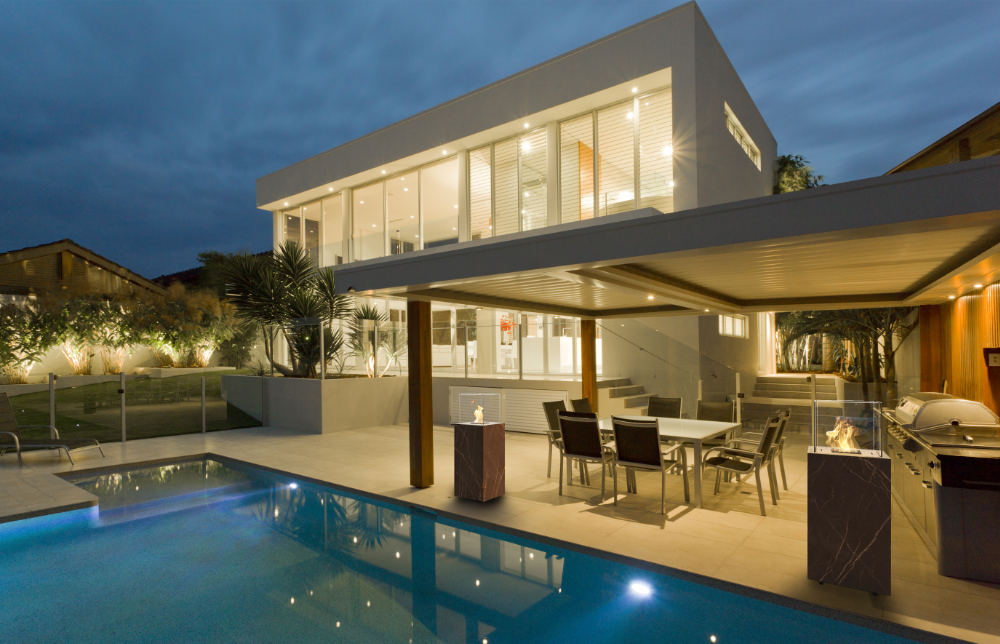 Porto Laurent est une cheminée au bioéthanol haut de gamme, habillée de plaques Dekton à finition marbrée, idéale pour une utilisation en extérieur.